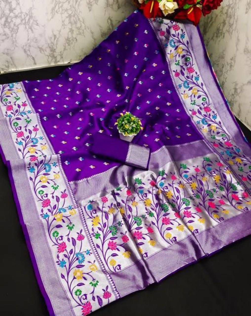 This is a stunning Aanya Purpal Paithni Silk Saree adorned with vibrant and elegant floral embroidery. The body of the saree features a sleek black base, subtly embellished with small multicolored floral motifs in shades of blue, pink, yellow, and green, giving it a graceful and festive touch. The standout feature is the broad silver-grey border and pallu, intricately embroidered with a cascade of colorful flowers and delicate leafy vines in contrasting hues. This beautifully crafted saree strikes the perfect balance between traditional charm and contemporary elegance, making it ideal for festive occasions, parties, or cultural events.