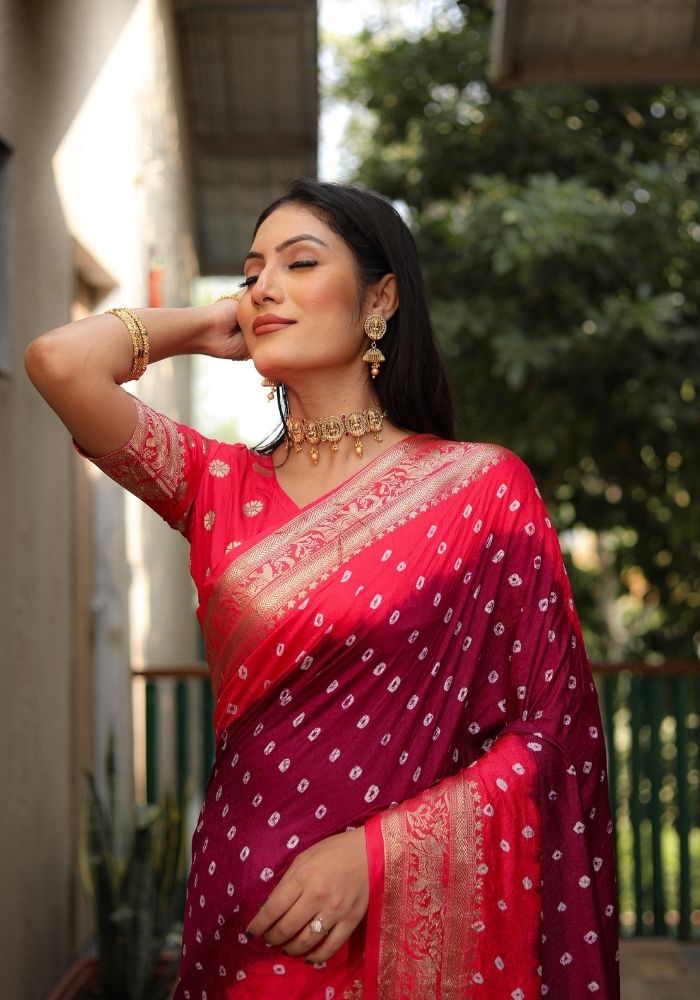 This is a beautiful Ziyana Gajari Maroon Bandhej (Bandhani) Silk saree featuring a vibrant combination of maroon and Gajari shades. Here's a detailed description: